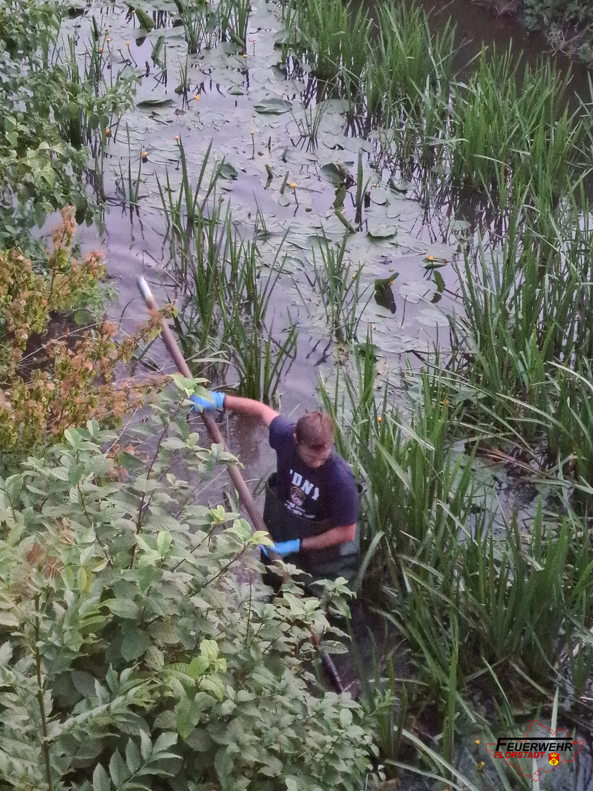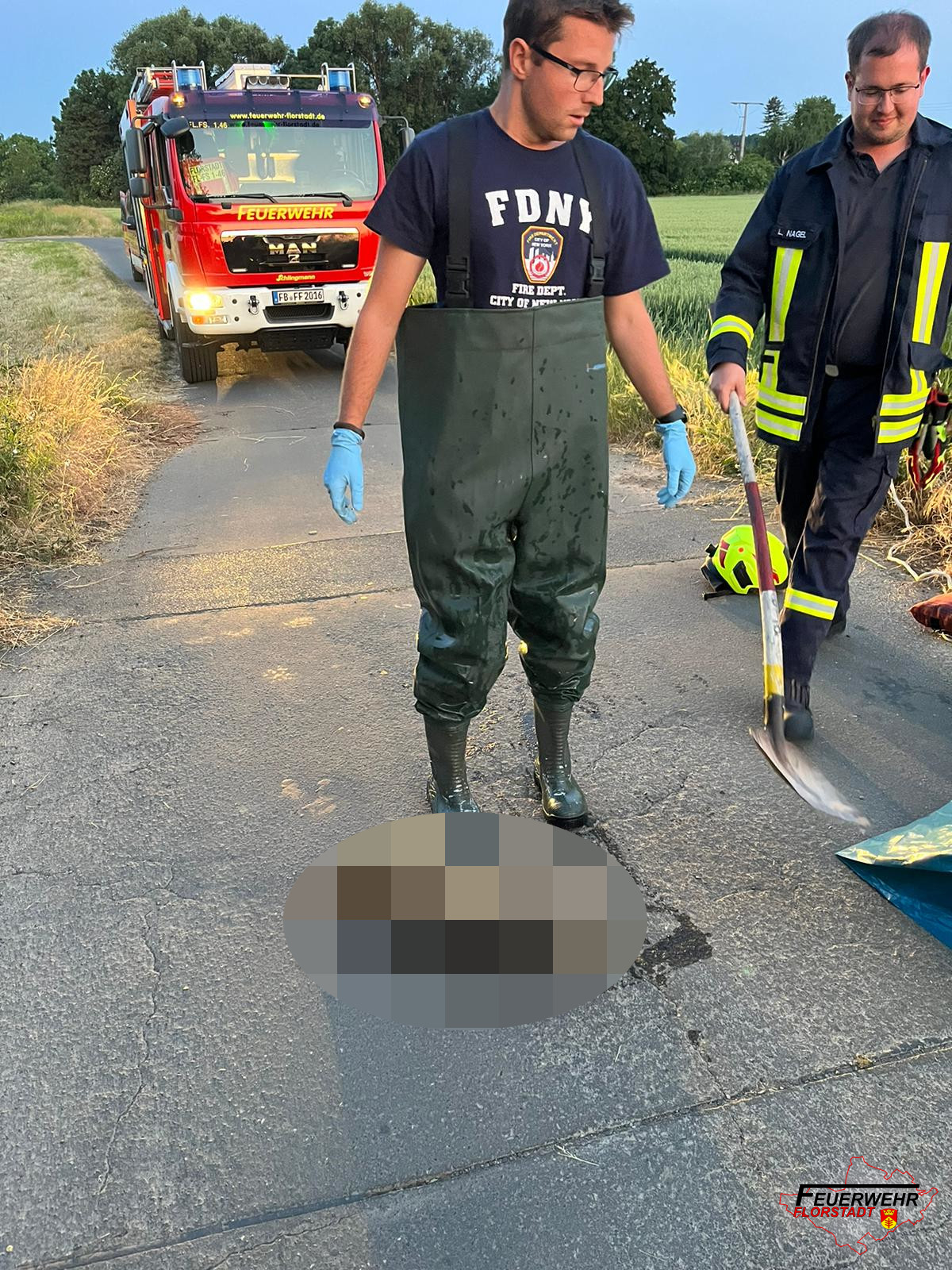 Am Mittwochabend wurden wir durch die Polizei zu einer Amtshilfe an der Horloffbrücke in Ober-Florstadt angefordert. Dort hatten Passanten Tierkadaver, die in dem Fluss trieben, entdeckt. Diese wurden von uns geborgen und an die Polizei übergeben, welche sich um den Abtransport kümmerte.