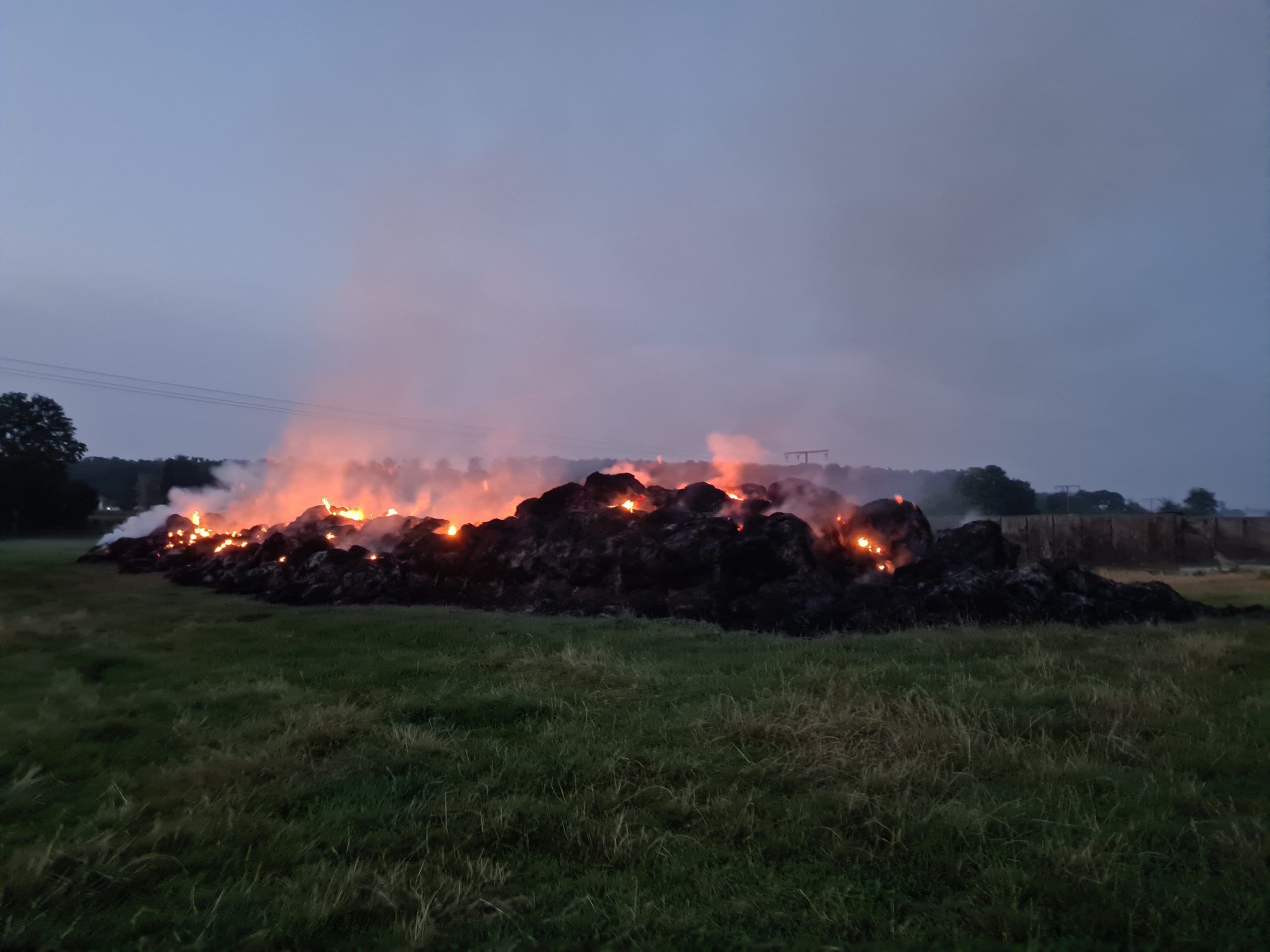 Beim Eintreffen der ersten Kräfte standen die ca. 350 Strohballen bereits in Vollbrand. Da eine Rettung der Strohmiete nicht mehr möglich war, ließen wir diese kontrolliert abbrennen. Im frühen Einsatzverlauf wurde die nahe des Feuers verlaufende Oberleitung durch die OVAG abgeschaltet.